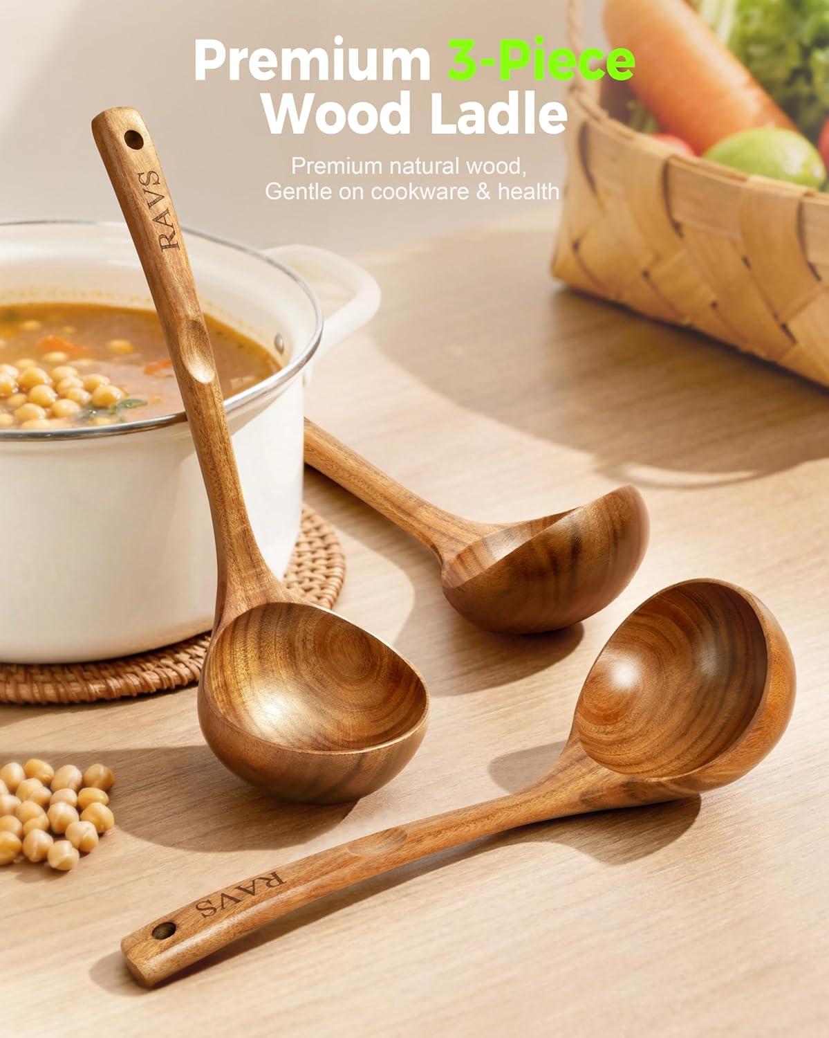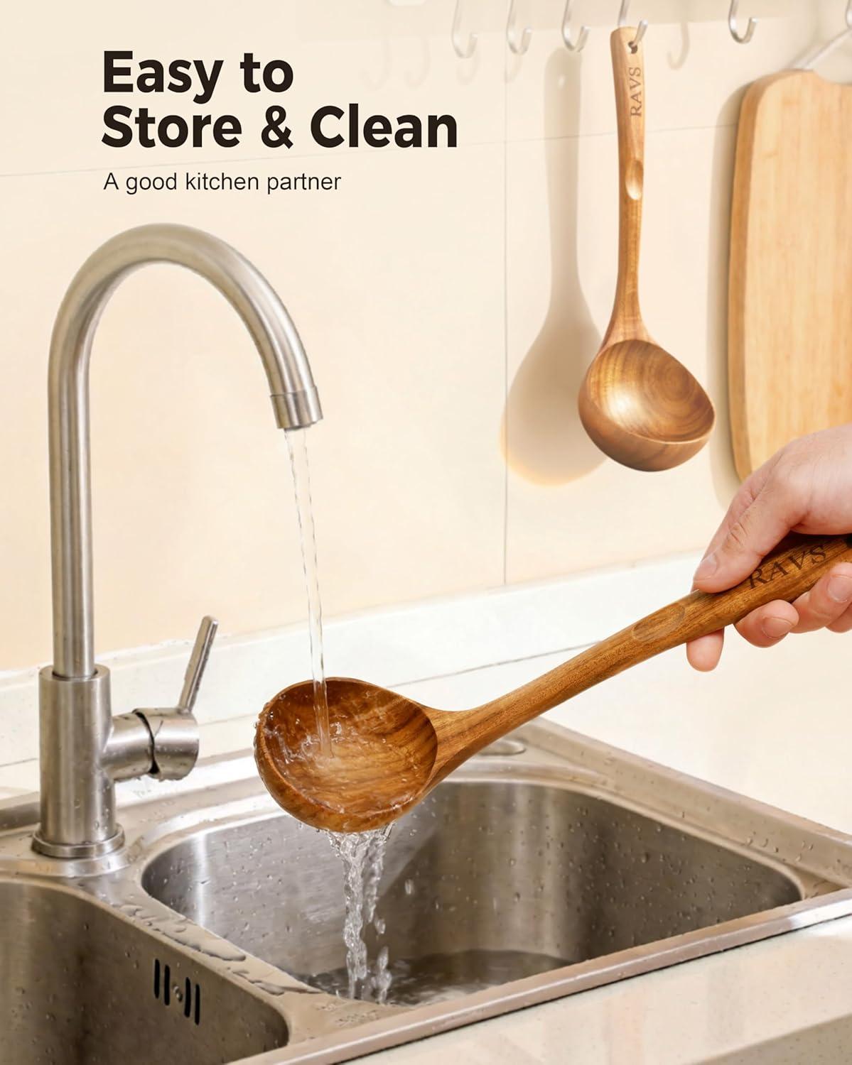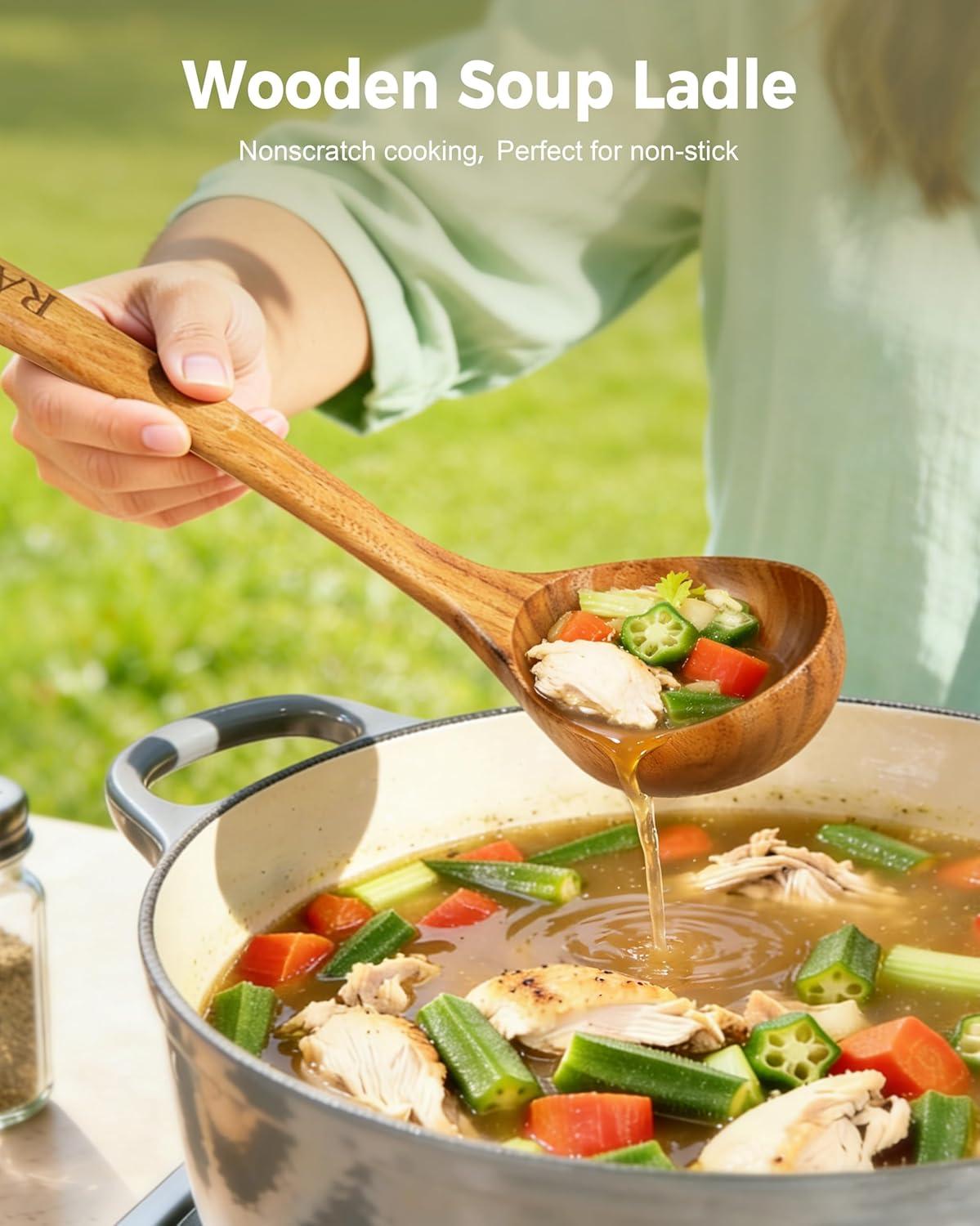 Multi-Purpose Kitchen Tool:From serving hot soup and pasta sauce to stirring oatmeal and skimming broths, the RAVS wood spoons for cooking is an incredibly versatile tool. The wooden soup spoons are gentle on all cookware surfaces, including non-stick pots, making it an indispensable accessory for everyday cooking.