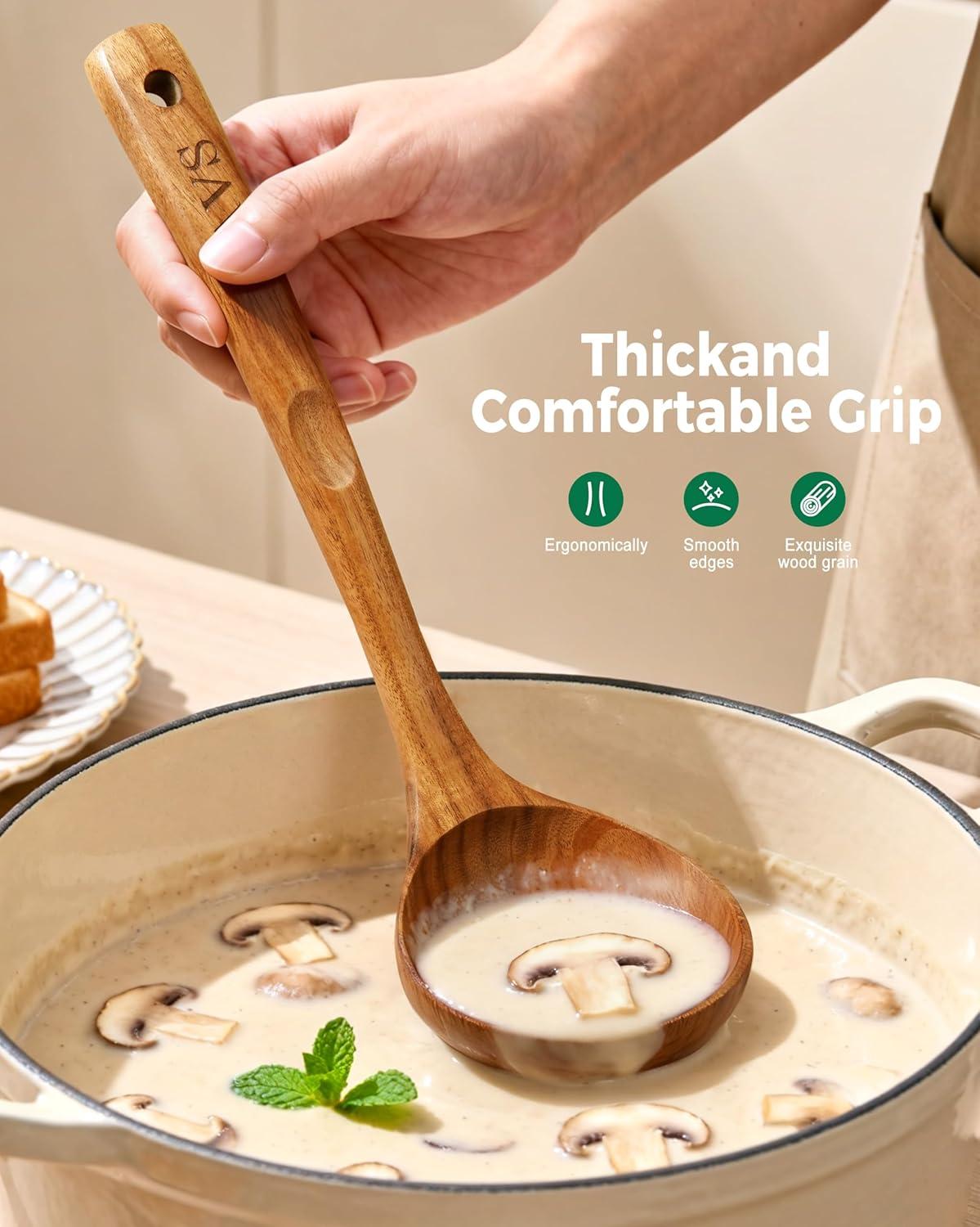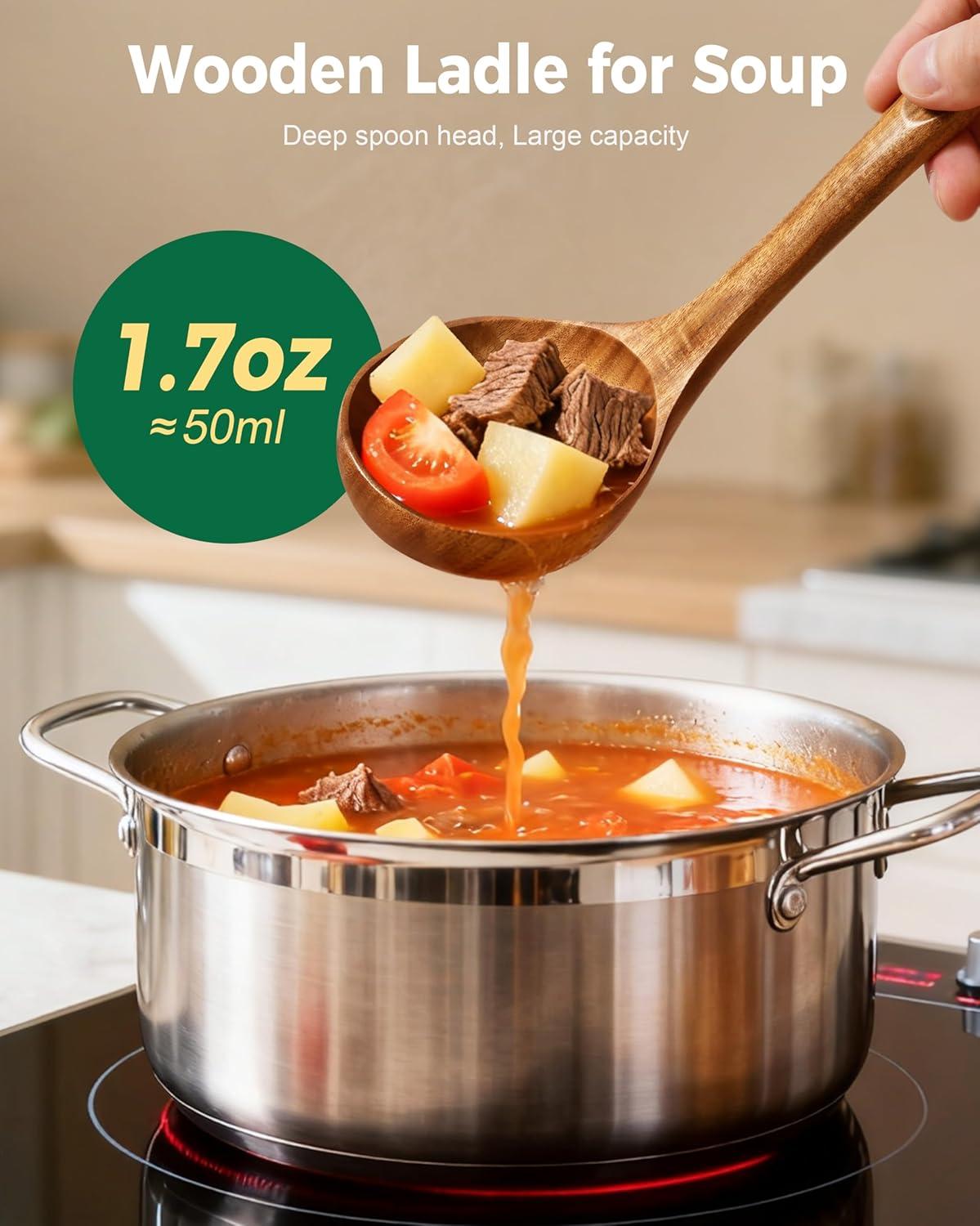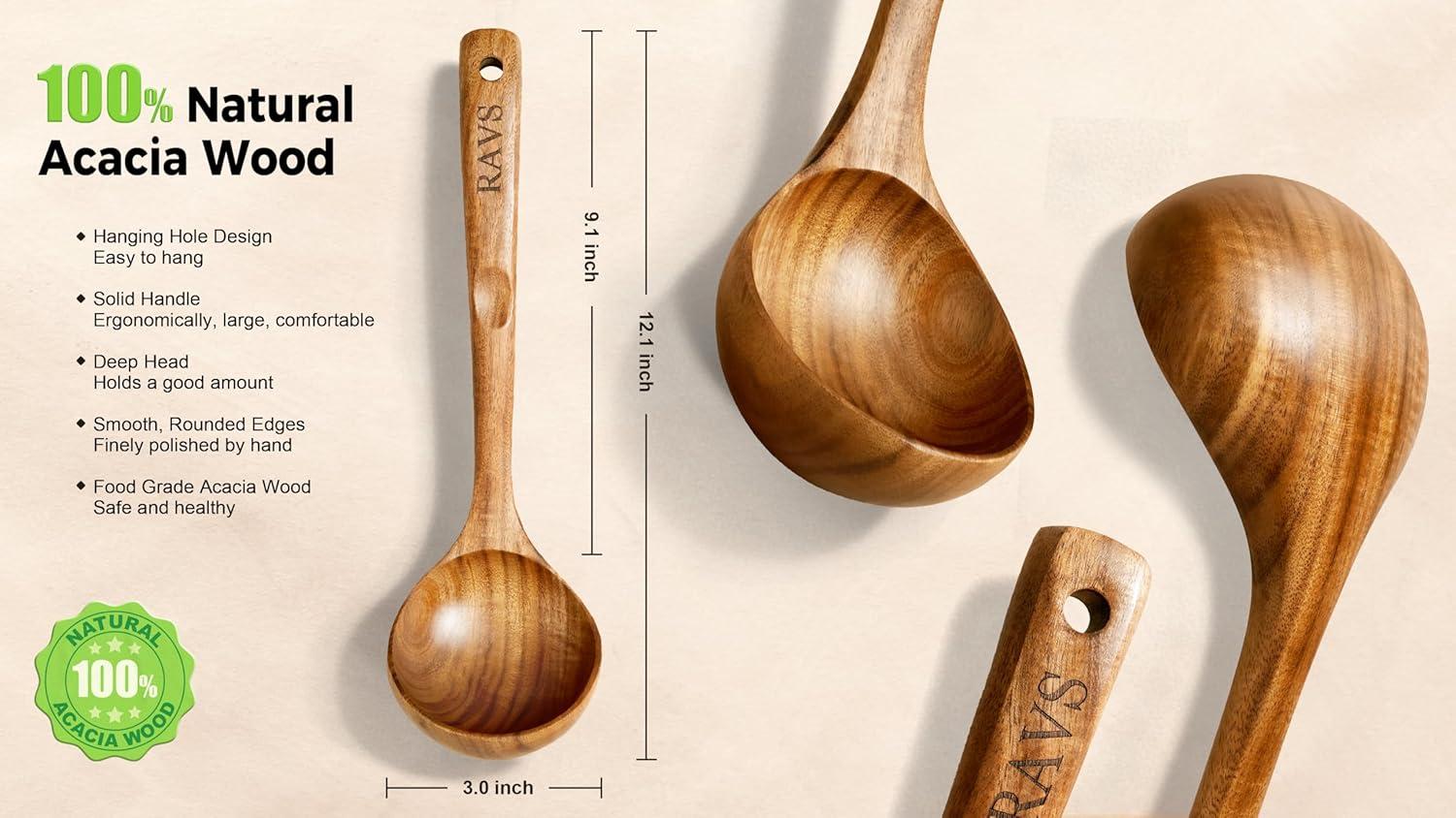 Natural & Safe for Your Family:Your health is our priority. This wood ladle is made from high-quality, natural acacia wood, will not scratch surfaces, safe for use on nonstick cookware. It's a safe and reliable choice for preparing meals for your loved ones.
