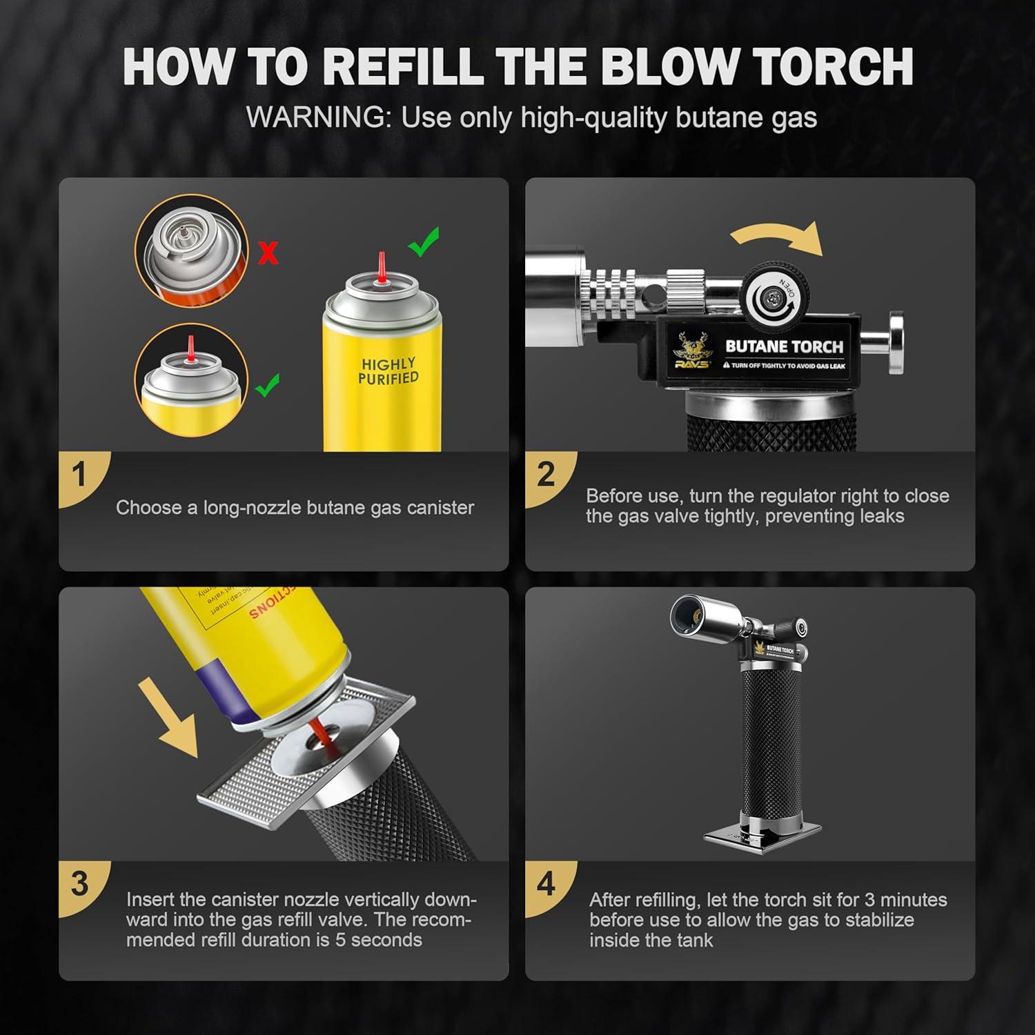 Refillable blow torch: The cooking torch usually takes 5-7 seconds for full refilling (8-11g). The package includes 3* red accessories for extending the short nozzle gas tank and venting. ➡ NOTE: Please ensure to turn off the creme brulee torch before refilling. (Butane Gas Isn't Included)