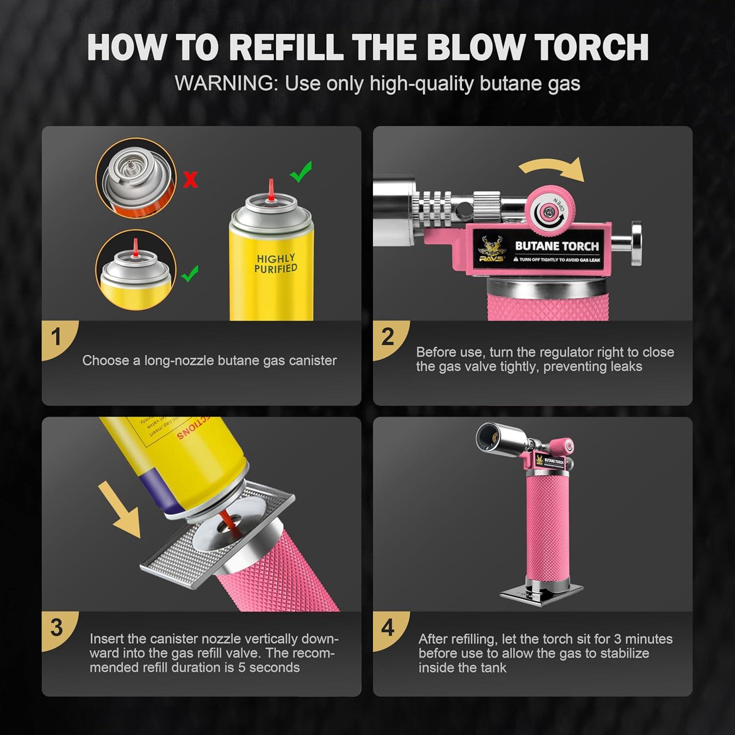 Refillable blow torch: The cooking torch usually takes 5-7 seconds for full refilling (8-11g). The package includes 3* red accessories for extending the short nozzle gas tank and venting. ➡ NOTE: Please ensure to turn off the creme brulee torch before refilling. (Butane Gas Isn't Included)