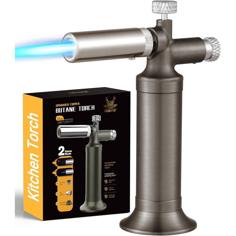 Stable Copper Base & Convenient Refilling: RAVS butane torch lighter features a removable copper-tone base that keeps the hand torch upright and secure on any surface, allowing for hands-free operation. The universal bottom-fill valve of soldering torch is compatible with all standard butane butane gas tank and includes a precision seal system to ensure leak-proof performance.