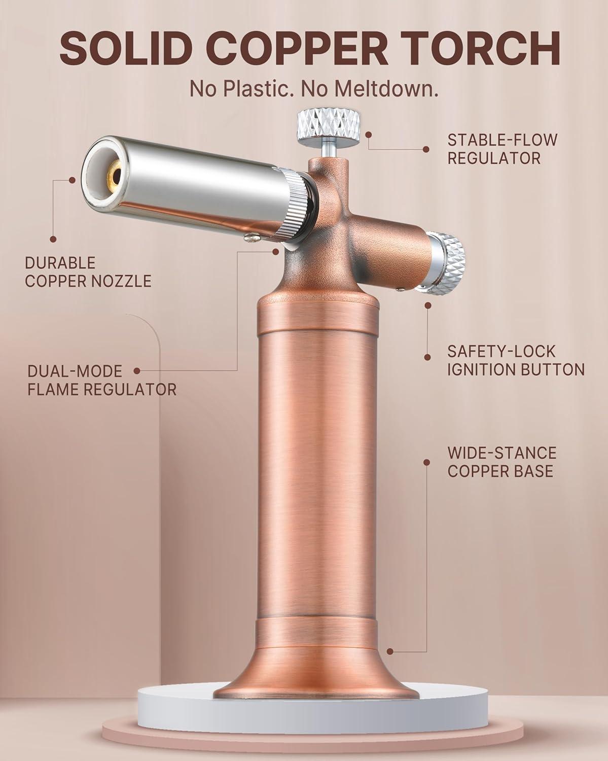 Solid Copper Construction: The RAVS butane torch is crafted from premium copper for exceptional impact resistance and longevity. It withstands drops that would break plastic torch lighters and won't degrade over time. The balanced weight distribution of this mini torch provides exceptional control and stability during precision work, while the robust construction ensures reliable performance through years of kitchen use.