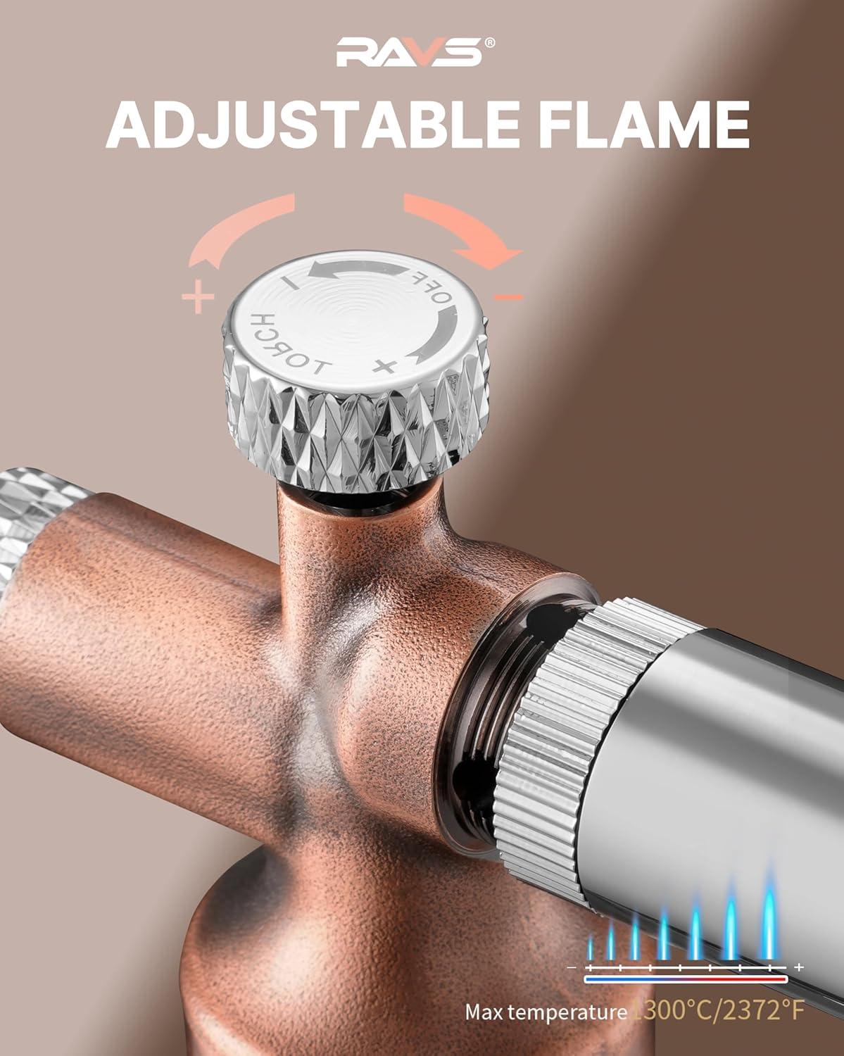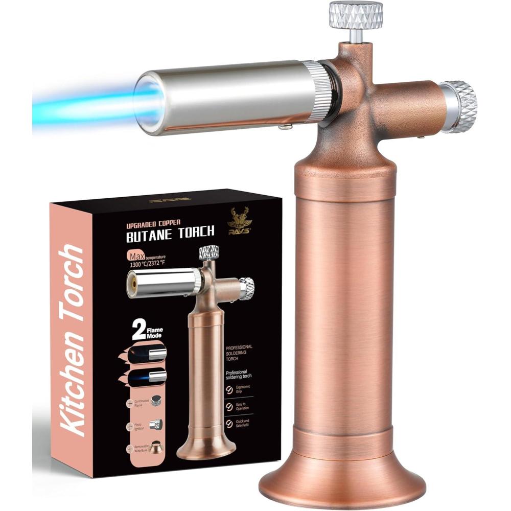 Stable Copper Base & Convenient Refilling: RAVS butane torch lighter features a removable copper-tone base that keeps the hand torch upright and secure on any surface, allowing for hands-free operation. The universal bottom-fill valve of soldering torch is compatible with all standard butane butane gas tank and includes a precision seal system to ensure leak-proof performance.