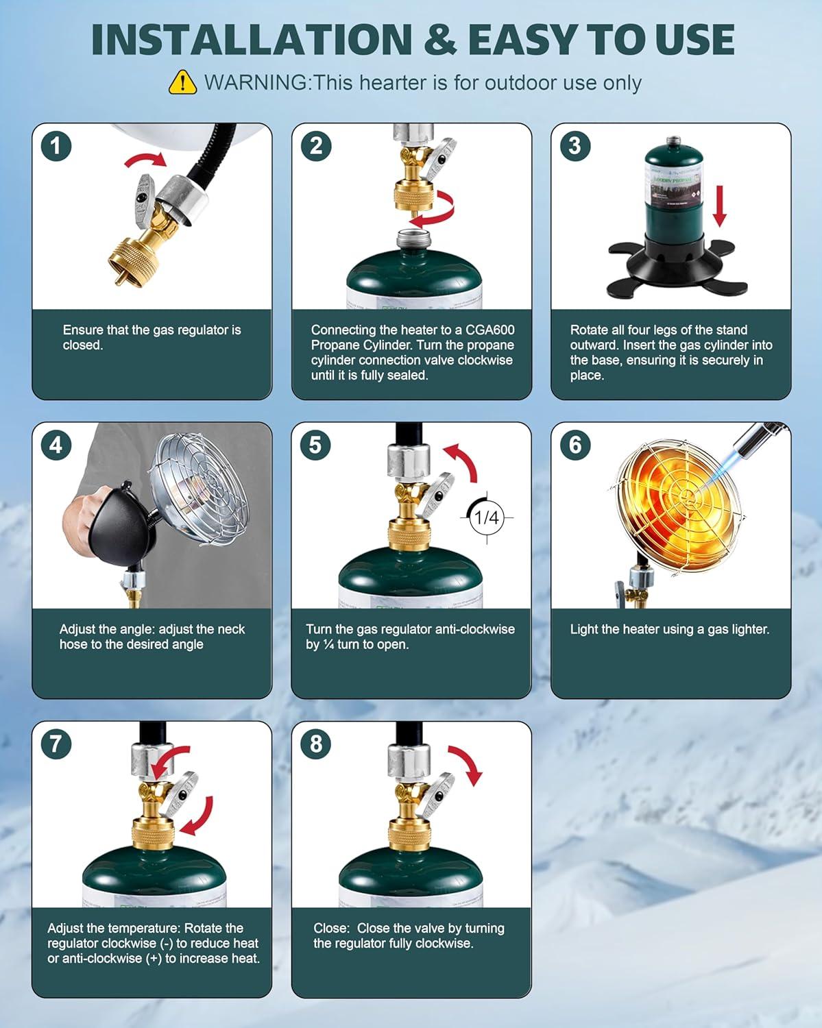 Multiple Uses Outdoor heater: Take the warmth of home anywhere you go with our portable propane heater. It's the perfect companion for garage heater, patio heater, outdoor heater, space propane heater, camping heater, tent heater for camping, gas heater . PLEASE READ INSTRUCTION MANUL BEFORE USING