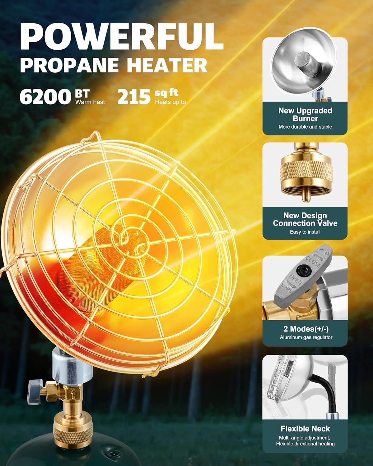 Powerful Heat Output for Quick Warmth: This camping heater is equipped with a new upgraded burner, burns more completely, delivers up to 6200BTU of heat, and is designed to quickly and efficiently heat up to 220 sq ft, such as your golf cart, tent, or garage workspace.
