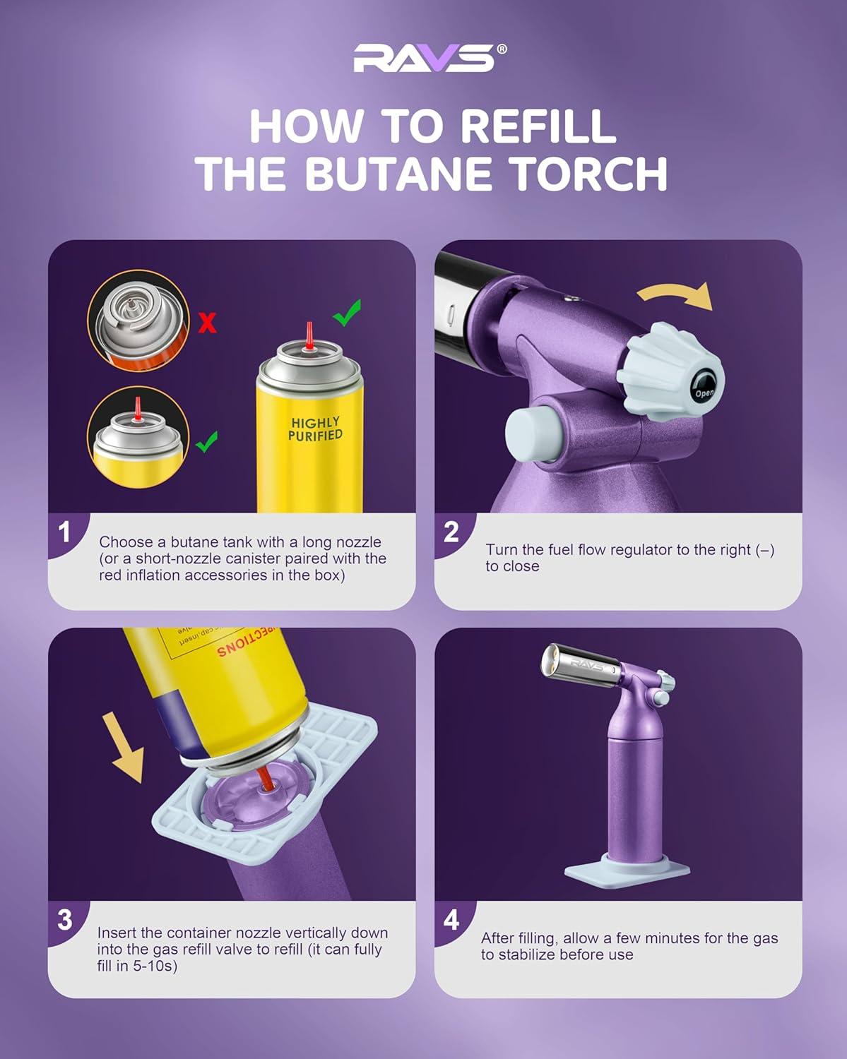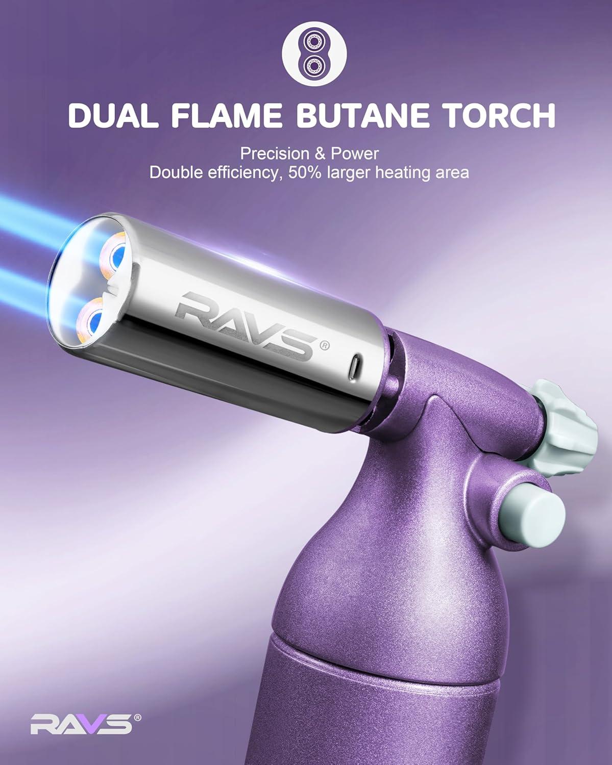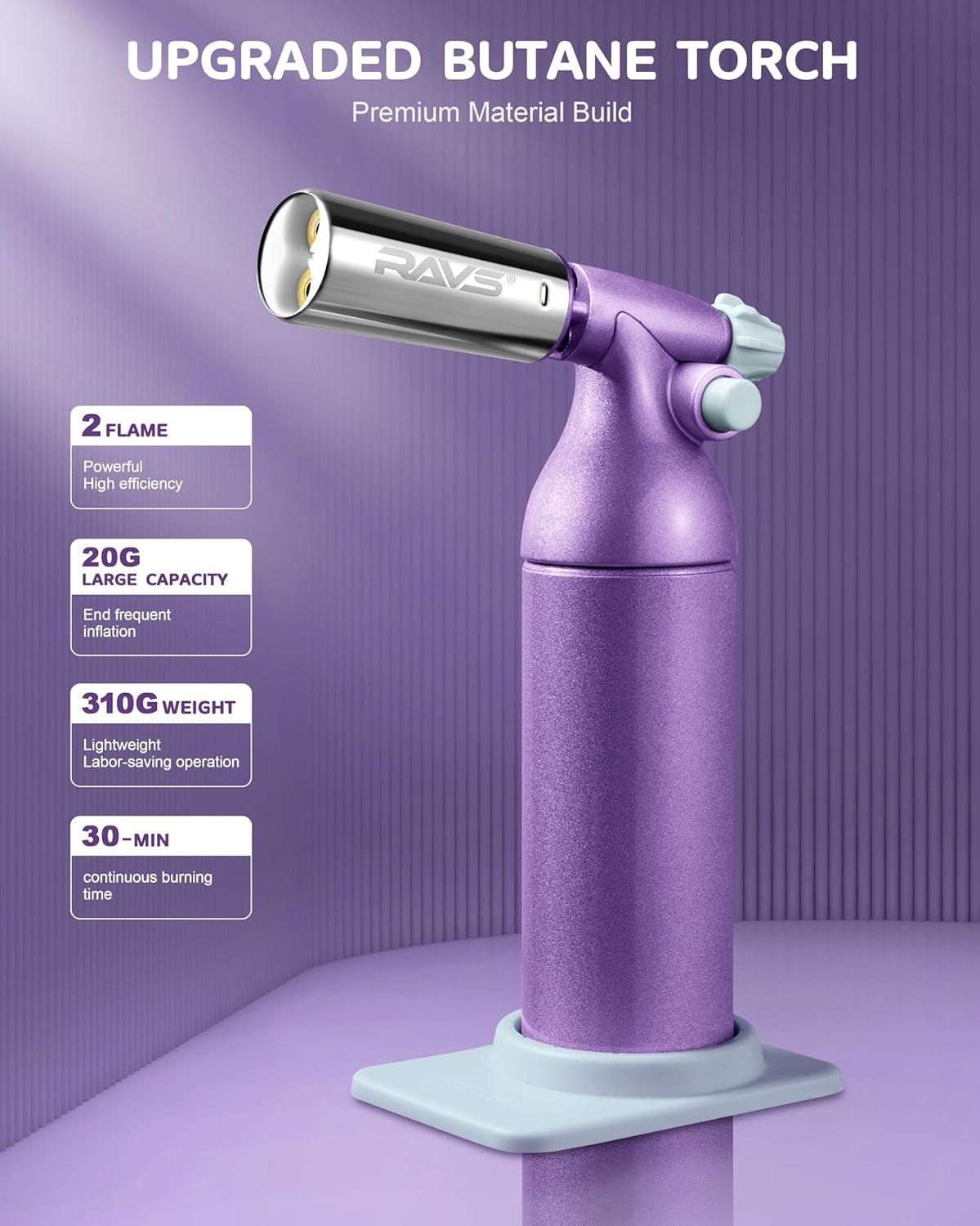 RAVS Refillable Double Flame Butane Torch, Creme Brulee Torch with Adjustable Flame, 20G Large Capacity Culinary Torch for Soldering, BBQ, Baking, DIY, Unique Gifts for Women, Butane Fuel Not Included(Crystal Purple)